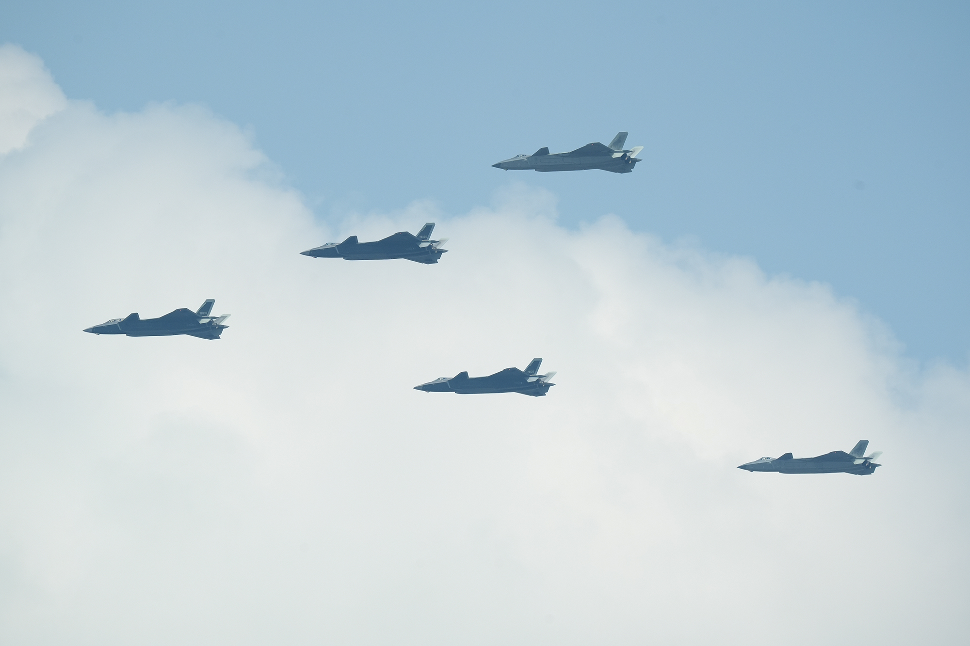 殲擊機梯隊接受檢閱。殲16D、殲20、殲35A、殲20S、殲20A,編成兩個楔隊震撼亮相。攝影:鄭宇航
