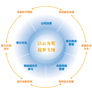 航空工業(yè)社會責(zé)任模型在邏輯上由集團(tuán)公司社會責(zé)任理念、五大支持體系和六項(xiàng)責(zé)任內(nèi)容組成。其中“以心為翼,在夢飛翔”的責(zé)任理念是核心,圍繞責(zé)任理念的是公司履行社會責(zé)任的五大支持體系,即公司治理、責(zé)任推進(jìn)管理、全面風(fēng)險(xiǎn)管理、利益相關(guān)方參與和責(zé)任文化。